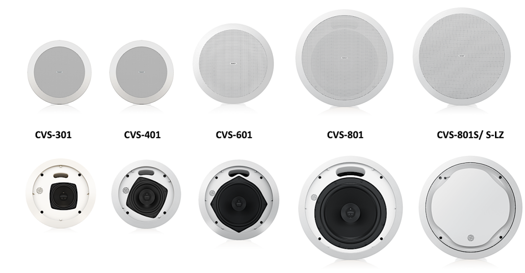 La gamme CVS propose cinq tailles d’enceintes CVS4-MICRO,CVS301/401/601/801 intégrant respectivement un boomer de 100/76/100/165/200 mm et une section aigu montée en coaxial 20 mm pour les modèles CVS4-micro ,CVS401/601 et de 25 mm pour la CVS801. Les modèles CVS801S et CVS801S-LZ ( uniquement sans transfo) sont destinés uniquement au renfort de grave. Tous ces modèles sont disponibles en blanc ou noir sauf CVS4-MICRO
