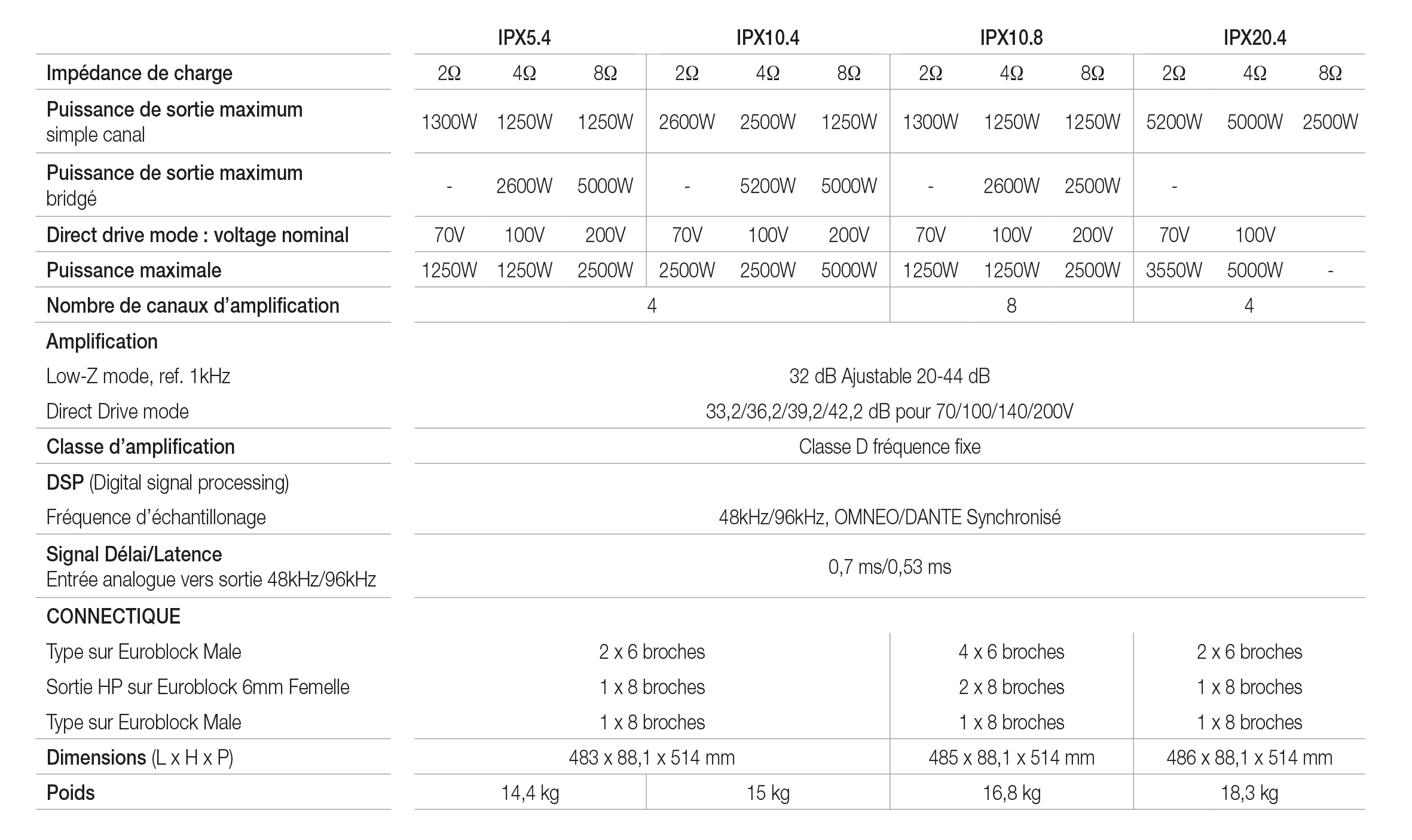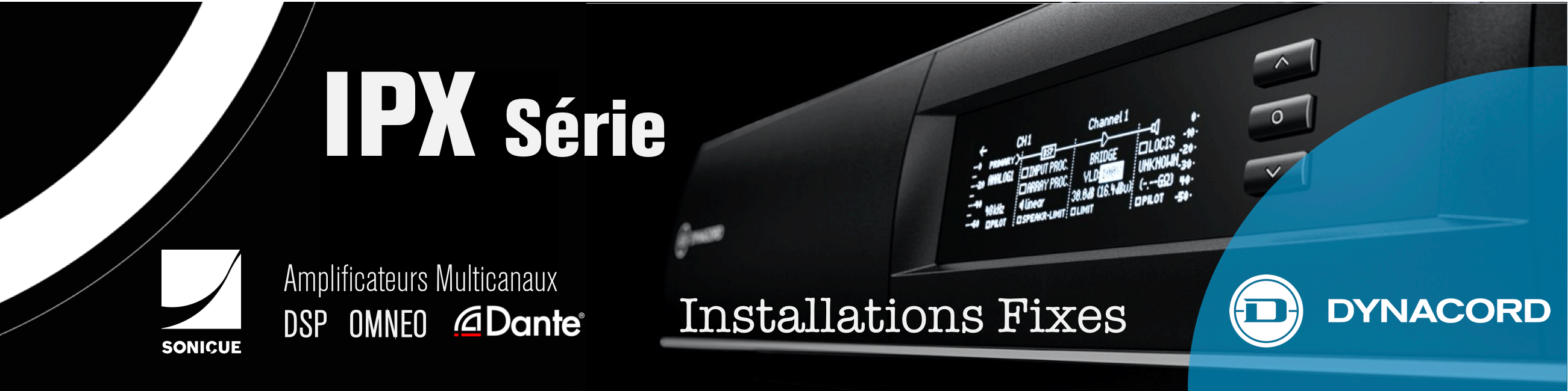 Ces amplificateurs 4 et 8 canaux se situent au sommet de la gamme et disposent de la technologie la plus avancée. Les possibilités offertes par le DSP intégré incluant bien sûr des filtres FIR sont extrêmement développées. Les IPX sont fabriqués en Allemagne et offrent une robustesse exceptionnelle. Ils sont destinés aux installations fixes et peuvent fonctionner en basse impédance et/ou en ligne 70/100V. Les amplificateurs IPX bénéficient d’entrées analogiques ainsi que d’une interface OMNEO/Dante. On peut donc les connecter directement à une console numérique fonctionnant en 96 kHz sans avoir à effectuer de conversion afin de conserver des performances optimales. On dispose d’une bascule automatique possible de numérique en analogique (à condition d’effectuer le câblage adéquat) en cas de perte d’horloge. Trois GPIO peuvent être définis par l’utilisateur pour modifier les paramètres de l’amplificateur ou transmettre des indications de paramètre à des dispositifs externes. Ils peuvent être configurés en entrée analogique, entrée numérique ou sortie numérique. Les deux autres ports sont des contacts à basculement de relais sans potentiel pour signaler l’état prêt (READY) ou de panne (FAULT).